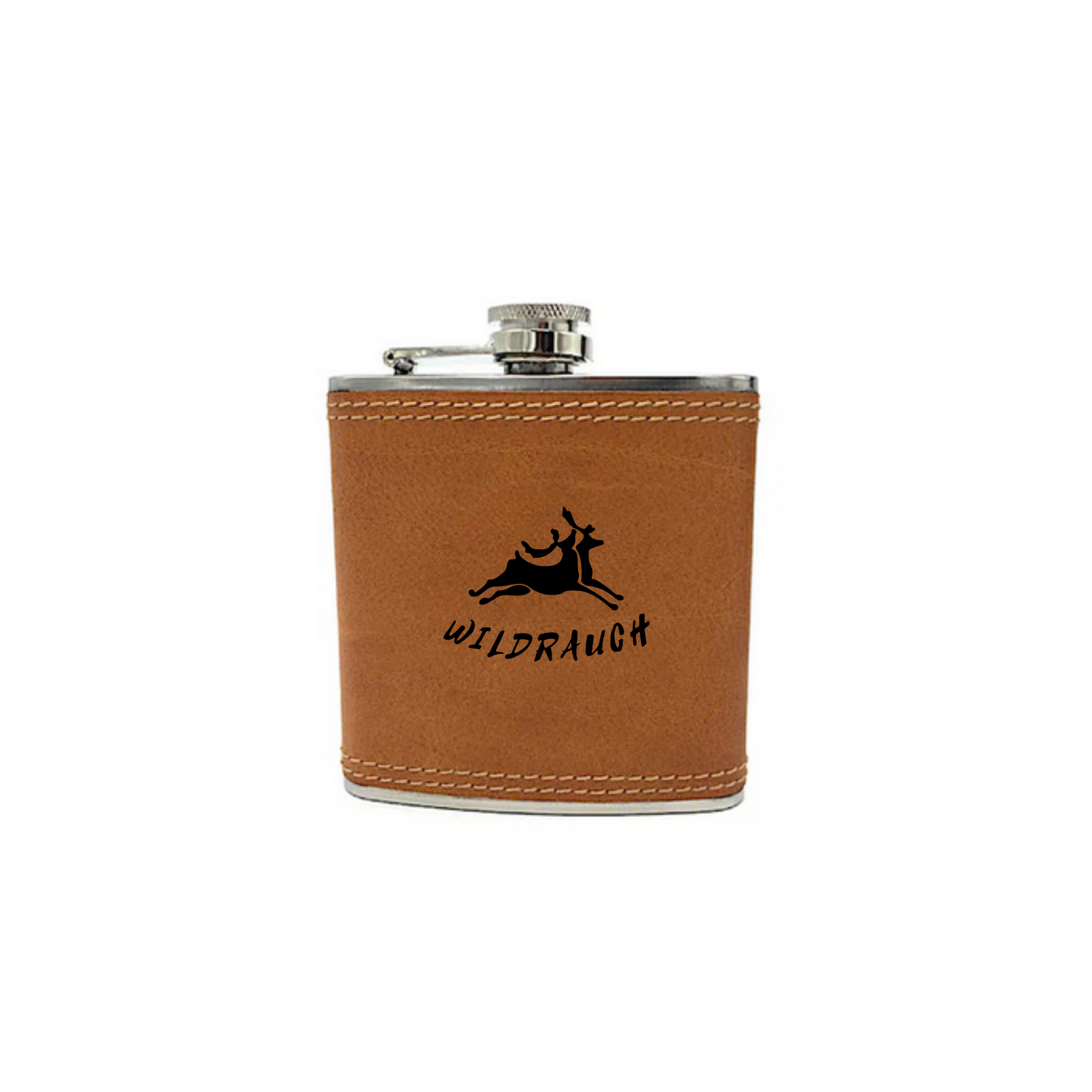 Flachmann aus Edelstahl mit Kunstleder-Beschichtung. Der Flachmann wirkt durch die Kunstleder-Beschichtung mit Wilkdrauch Gravur besonders edel.